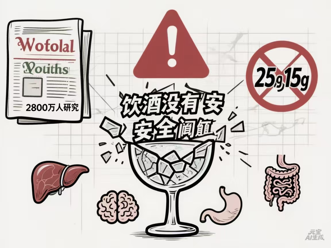 一句话总结: 饮酒没有安全阈值,一点不喝对健康最有利。