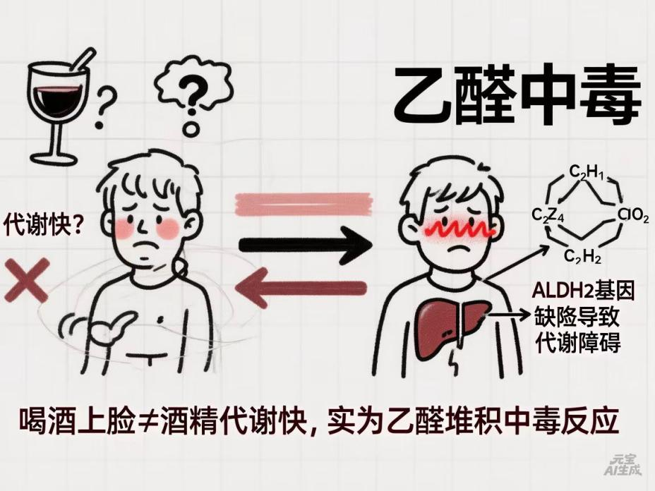 错误认知: 喝酒脸红说明代谢快,酒量好。 科学真相: 医学上把喝酒“上脸”称为“酒精性脸红反应”,因为它多见于东亚人群,因此也叫“亚洲人脸红综合征”。主要是因为身体缺乏高效分解酒精中间代谢产物乙醛的酶,导致饮酒后乙醛大量堆积,出现血管扩张、脸红、心悸、恶心等醉酒症状。乙醛是强致癌物,长期累积会极大增加患食道癌等疾病的风险。