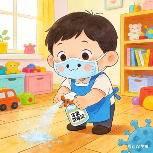 门把手、水龙头、玩具、桌面、卫生间表面、地面(使用含氯消毒液浸泡的毛巾擦拭消毒)