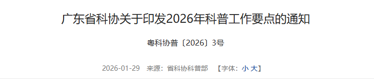1.推动全省科普依法依规创新发展。扎实履行省科普工作联席会议办公室和公民科学素质纲要实施工作办公室职责,科学谋划并扎实推进全省科普工作“一盘棋”各项工作。高质量编制《广东省全民科学素质行动规划纲要实施方案(2026-2030年)》,并申请以省政府名义印发实施。深入贯彻《中华人民共和国科学技术普及法》《广东省科学技术普及条例》,为科普创新发展营造更好的法治环境。