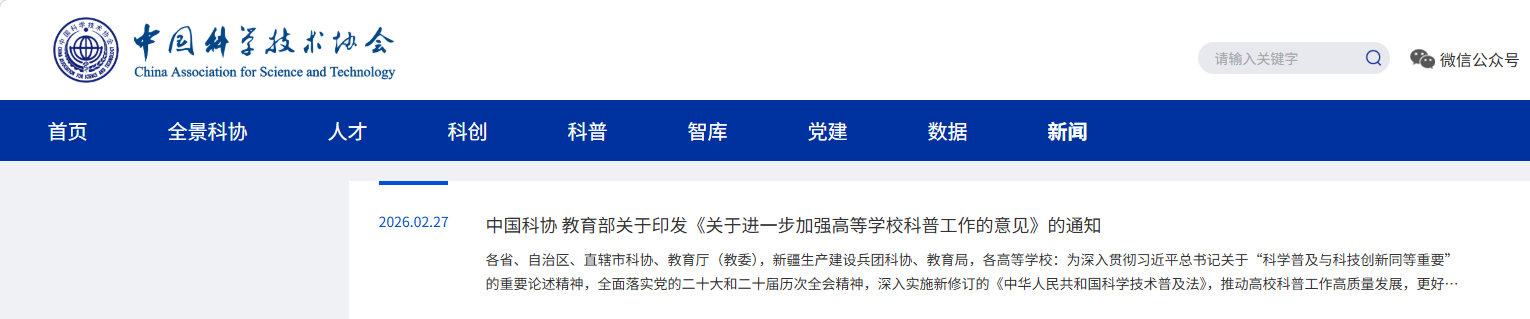 为深入贯彻习近平总书记关于“科学普及与科技创新同等重要”的重要论述精神,全面落实党的二十大和二十届历次全会精神,深入实施新修订的《中华人民共和国科学技术普及法》,推动高校科普工作高质量发展,更好服务公民科学文化素质提升,助力实现高水平科技自立自强,中国科协、教育部制定了《关于进一步加强高等学校科普工作的意见》,现印发给你们,请结合实际认真贯彻落实。